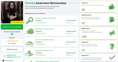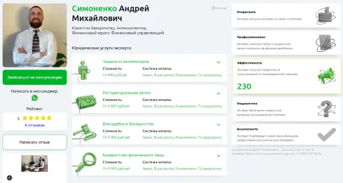 Один из самых уникальных случаев портала, когда самозанятый частный юрист по банкротству физических лиц обогнал многие лучшие компании Москвы по отзывам и показателям консультаций.