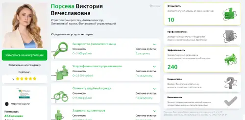 Сама владелец компании, Порсева Виктория Вячеславовна, активно проводит консультации и оказала более 240 онлайн-встреч должникам на нашей площадке. Профиль юриста доступен на Банкротологии в разделе юристов Москвы